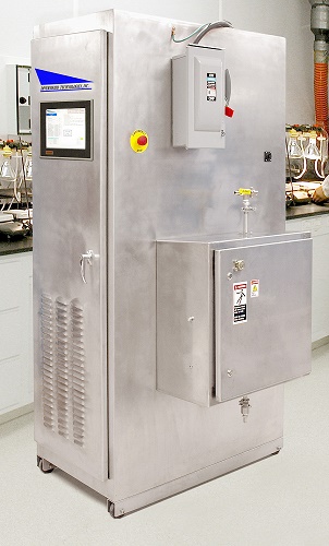 The front-mounted touch screen PLC provides simple operations and precise control, while the static or continuous treatment chamber enclosure located on the side allows for ease of cleaning and assembly. The pulsed electric field is applied to the fluid as it flows through the treatment zone.